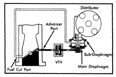 The spark control systems help reduce HC and CO emissions by delaying vacuum advance and lowering maximum combustion chamber temperatures. Some systems are designed to improve cold engine performance by advancing timing only when the engine is cold. Systems include a distributor with vacuum advance diaphragm(s), delay valve, thermal valve, and hoses. See appropriate Figurefor component usage and layout.