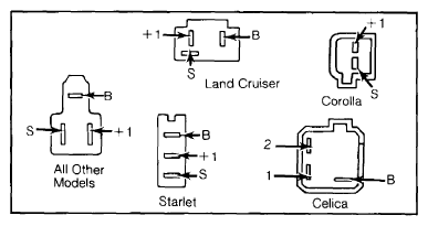 Unplug connector at wiper motor. Use an ohmmeter to check for continuity between terminals "+1", "+2" and "S". If there is no continuity, replace motor. See Figure.