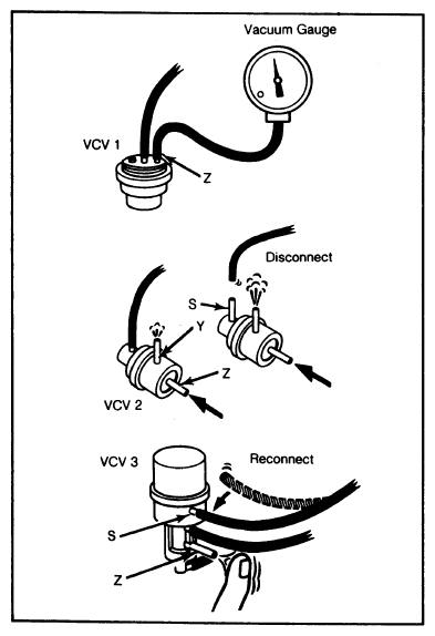 - Disconnect vacuum hose from port Y and Z of VCV 2. Check that a small amount of air flows from port Z to port Y. Disconnect vacuum hose from port S. Check that air flow increases. Reconnect hoses.