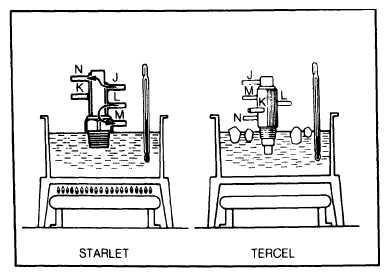 - Drain coolant from radiator and remove TVSV. Immerse threaded end of valve in container of water with thermometer. See Figure.