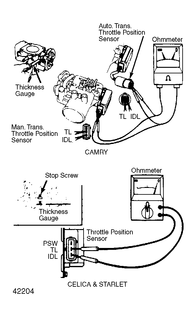 Turn ignition off and disconnect electrical connector at TPS. Insert a thickness gauge between throttle stop screw and throttle lever. Using an ohmmeter, check resistance values. See Fig 1. If values are not as specified in chart, adjust or replace TPS.