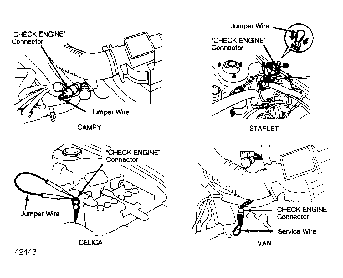 - Turn ignition on, but DO NOT start engine. Remove rubber cap from "CHECK ENGINE" connector. See Fig 2. Using a jumper wire, jumper both terminals of the connector together.