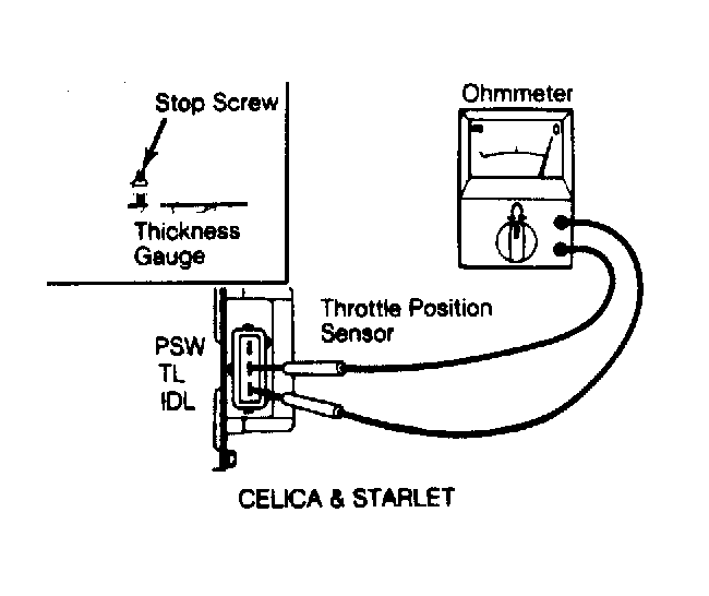 Turn ignition off and disconnect electrical connector at TPS. Insert a thickness gauge between throttle stop screw and throttle lever. Using an ohmmeter, check resistance values. See Fig 1. If values are not as specified in chart, adjust or replace TPS.