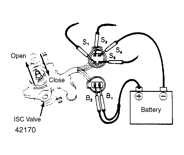 - Check resistance values of ISC valve. Check resistance with ignition off and ISC electrical connector disconnected. If resistance is not as specified in chart, replace ISC valve.