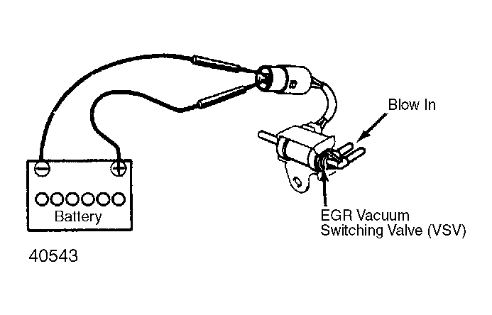 - Connect battery voltage to VSV terminals. See Fig 1. Blow air into port "E" (nearest valve) and check that air comes out port "F" (farthest from valve). Disconnect battery and repeat test. Air should come out front port ("G").