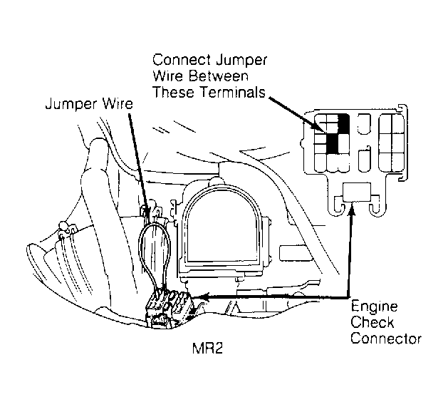 - Turn ignition switch to "ON" position. DO NOT start engine. Using a sub-wire, short terminals T - E1 of "CHECK ENGINE" connector. See Figure.
