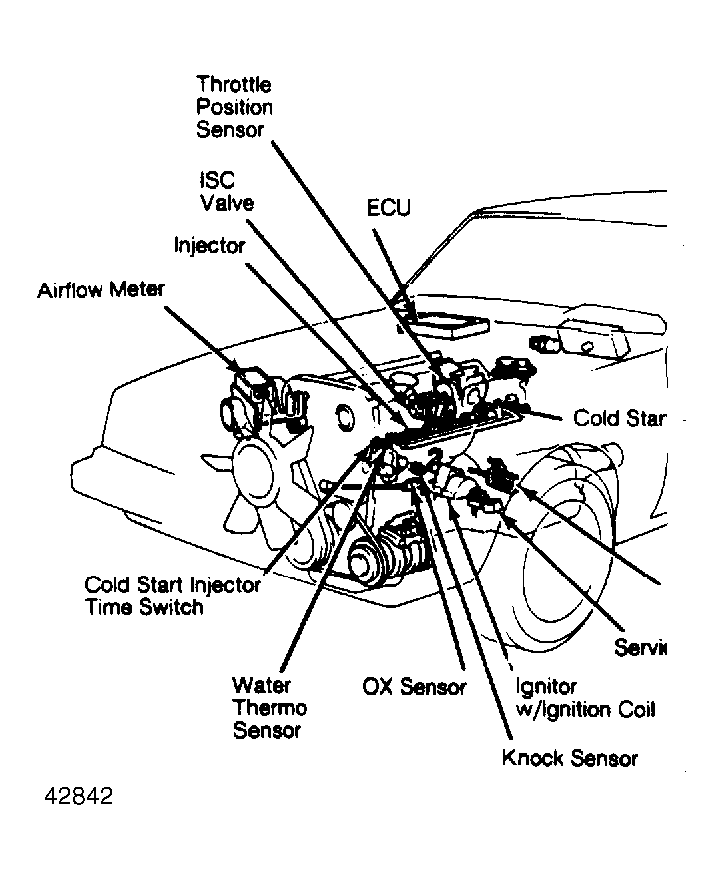 The TCCS consists of the following subsystems: Electronic Fuel Injection (EFI) system, Data Sensors, Electronic Control Unit (ECU), Electronic Spark Advance (ESA) system, Idle Speed Control (ISC) system, EGR Control, Electronic Controlled Transmission (ECT), Diagnostic System and catalytic converter. See Figure.