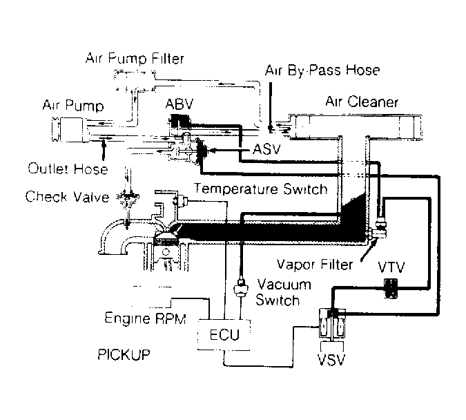 - Keep air by-pass hose disconnected and engine at idle. Disconnect hose at VTV, which goes to vapor filter. See Figure. Air should exit from hose within 7-14 seconds. Reconnect hose to VTV.