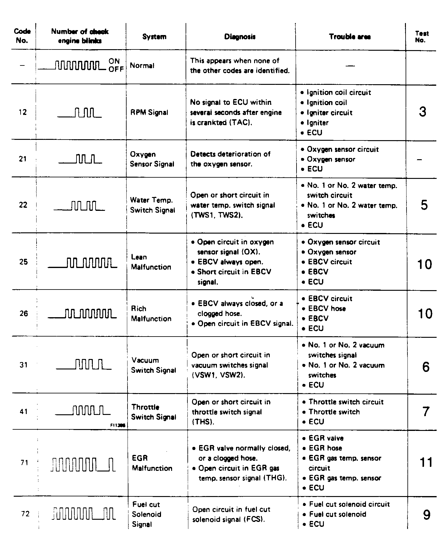 - Count number of flashes from "CHECK ENGINE" light. If system is operating properly (with no codes), "CHECK ENGINE" light will blink continuously and evenly. A code will be identified by a .5 second flash on and off for the first number. A 1.5 second pause will occur followed by the second number. See Fig 1.