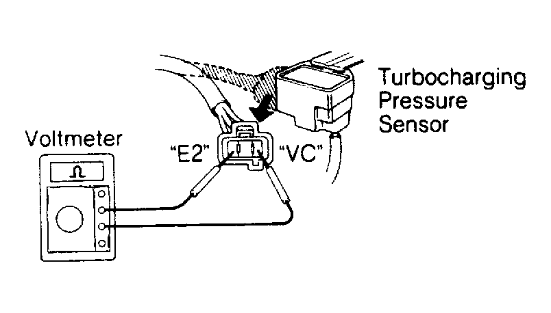 Turn ignition on. Disconnect turbocharging pressure sensor connector and measure voltage between terminals "VC" and "E2" of harness connector. See Fig 1. Voltage should be 4-6 volts.