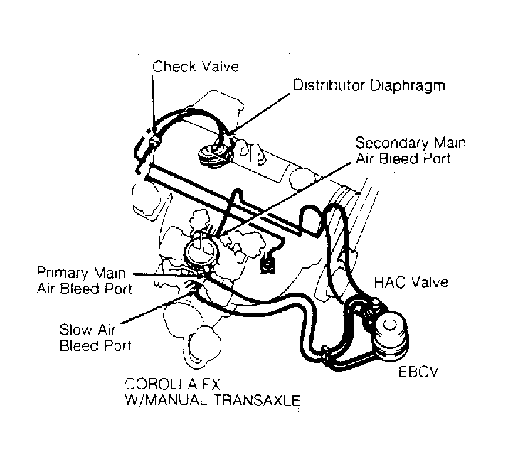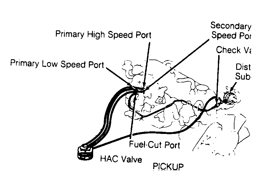 As altitude increases, air pressure decreases and air/fuel mixture becomes richer. High Altitude Compensation (HAC) system supplies additional air to primary low and high speed circuits on all models, and secondary high speed circuits on some models. This helps reduce emissions and improve driveability. Ignition timing is advanced for better driveability.