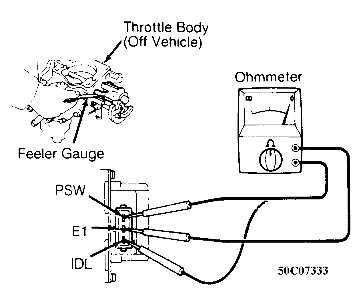 Turn ignition off and disconnect electrical connector at TPS. Note terminal identification. See Fig 1 through Fig 3 . Insert specified thickness feeler gauge between throttle stop screw and throttle ever. See TPS RESISTANCE SPECIFICATIONS table. Using an ohmmeter, check for resistance or continuity. Replace or adjust TPS if not within specification. See TPS RESISTANCE SPECIFICATIONS table.