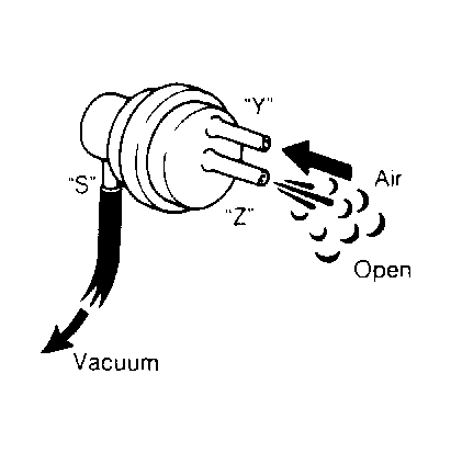Remove VCV valve. See Fig 1. Using a vacuum pump, apply 12 in. Hg vacuum to port "S". See Fig 2. Blow air into port "Y" and ensure VCV opens. Release vacuum. Blow air into port "Y" and ensure VCV closes. If valve fails to operate as specified, it must be replaced.