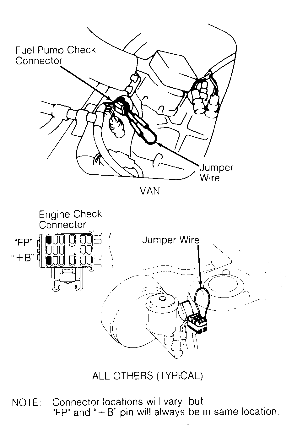 - On all models, install jumper wire between engine check connector "FP" and "B" pins. See Figure. See ENGINE CHECK CONNECTOR LOCATION table.