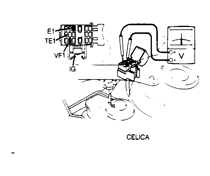 - Connect jumper wire to engine check connector terminals "FP" and "+B" to pressurize fuel system. For engine check connector locations, see Fig 1. Connector terminals are marked on inside of check connector cover. Fuel pump check connector is 2-wire connector near airflow meter in left rear corner of engine compartment (White/Black and Green wires).