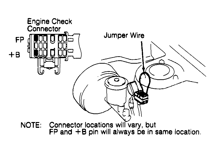 - Install jumper wire between engine check connector FP and +B pins. See Figure. See ENGINE CHECK CONNECTOR LOCATION table.