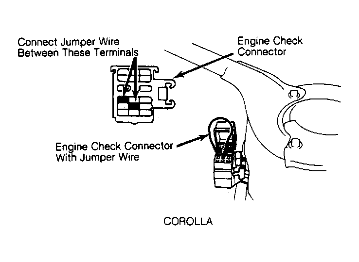 - Turn ignition switch to "ON" position with engine off. Place jumper wire across "TE1" (or "T") and "E1" terminals in engine check connector. See Fig 1.