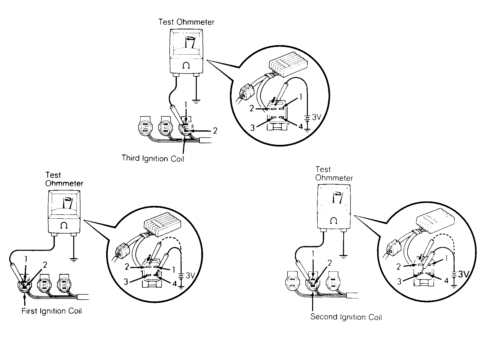 4. Connect ohmmeter between terminal No. 2 of second ignition coil and ground. Apply 3 volts to terminal No. 3 of 4-pin connector. With 3 volts still applied to No. 3, also apply 3 volts to terminal No. 2. Ensure ohmmeter indicates momentary continuity. See Fig 2.