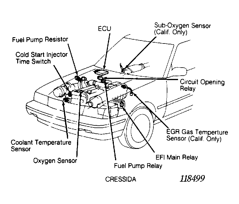 - Using ohmmeter, check resistance between terminals "STA" & "STJ" at appropriate temperature. See Fig 1. See COLD START INJECTOR TIME SWITCH SPECIFICATIONS table. There should be continuity between terminal "STA" and ground. Replace switch if not within specification.