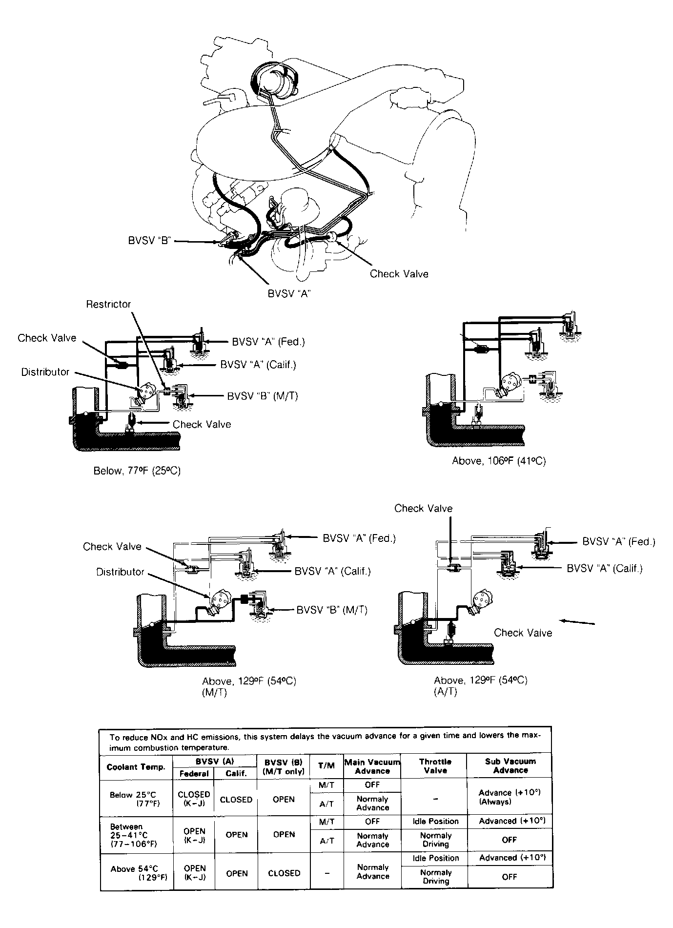 - On all models, remove distributor cap, rotor and dust cover. Apply vacuum to both diaphragms and note that distributor advance moves. Repair as necessary if no movement exists. If system operation is not as described, test individual components. Test BVSV "A", BVSV "B" (M/T), restrictor and check valve.