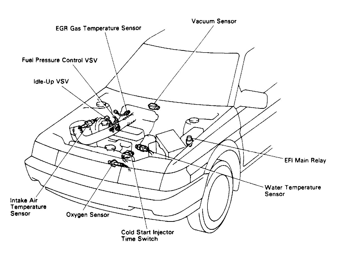 - Inspect coolant temperature sensor for correct operation. See ENGINE SENSORS & SWITCHES . For idle-up vacuum switching valve location see Figure. Using ohmmeter, measure resistance between idle-up vacuum switching valve connector terminals. See Fig 1. Resistance should be 30-36 ohms. Ensure no continuity exists between vacuum switching valve case (body) and each terminal. If not as specified, replace vacuum switching valve.