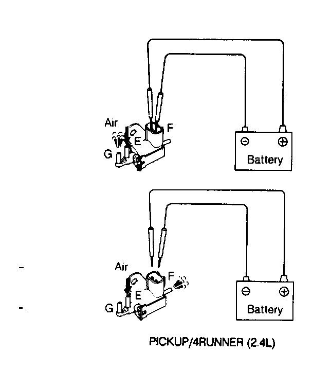 - Remove vacuum switching valve from vehicle. VSV is located on top of valve cover on 2.4L, on right fenderwell on 3.0L. Check for continuity across valve wiring terminals. Resistance should be about 33-50 ohms at room temperature. There should be no continuity between each terminal and body of valve. To check operation, see Fig 1 and Fig 2.