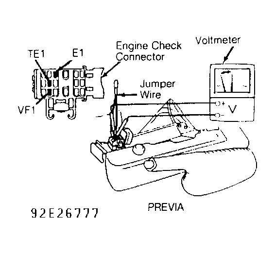 3. Place container under cold start injector. Connect jumper wire to engine check connector terminals FP and B+ to pressurize fuel system. For engine check connector locations, See Figure. Turn ignition on, with engine off.
