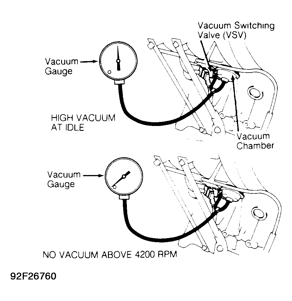 - Warm engine to normal operating temperature. Shut engine off. Using a 3-way connector, install vacuum gauge in vacuum line between Vacuum Switching Valve (VSV) and vacuum chamber for variable induction system. See Fig 1.NOTE: The VSV may also be referred to as the T-VIS VSV.