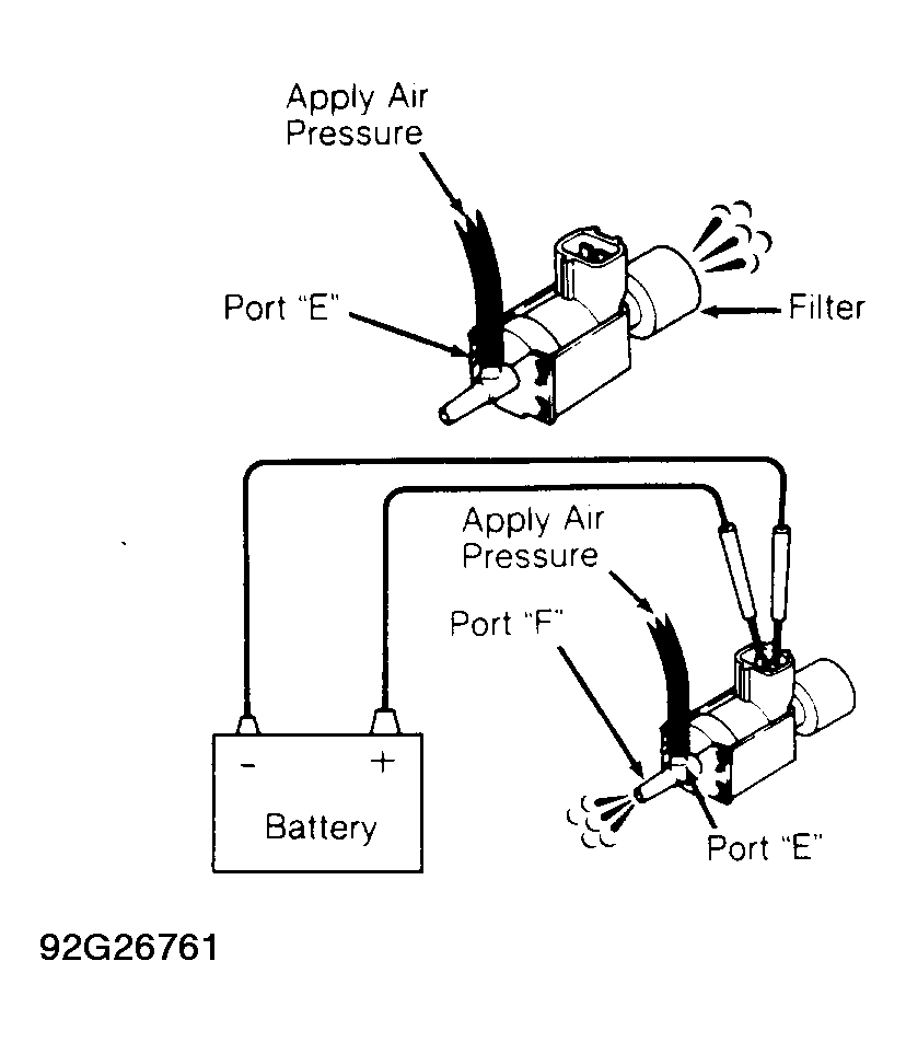 - Apply air pressure to port "E" and ensure air passes out the filter. See Fig 2. Connect battery voltage to VSV terminals. Apply air pressure to port "E" and ensure air passes out port "F". See Fig 2. Replace VSV if defective and recheck system operation. If VSV is okay, check wiring circuit. See appropriate wiring diagram in WIRING DIAGRAMS article in the ENGINE PERFORMANCE Section.