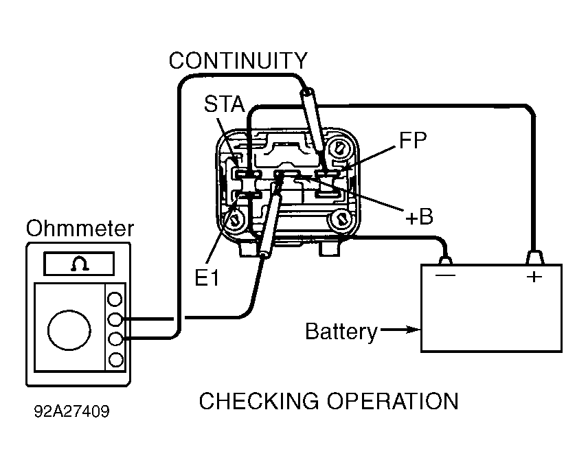 - Check circuit opening relay operation by applying battery voltage and checking continuity between specified terminals. See Fig 1 & Fig 2 . Replace circuit opening relay if defective.