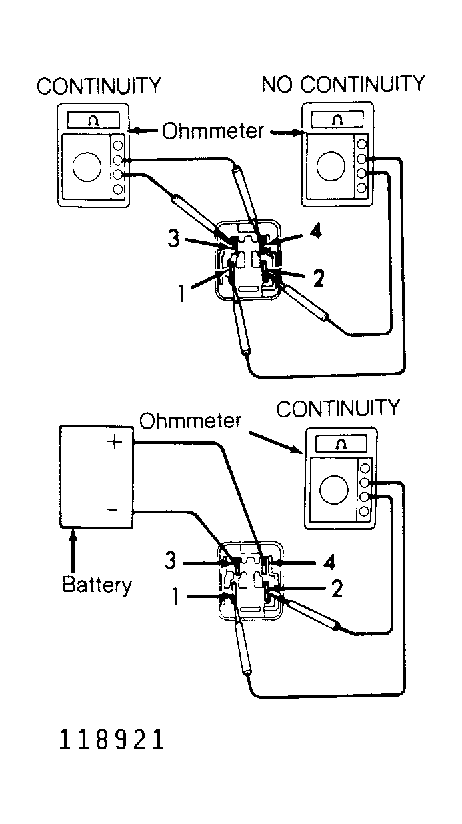 - Check EFI main relay operation by applying battery voltage and checking continuity between specified terminals. See Fig 1. Replace EFI main relay if defective.