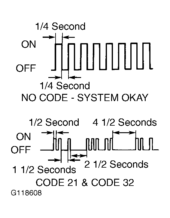 - If more than one code is stored, a 2 1/2-second pause will occur before next code is flashed. Once all fault codes are displayed, a4 1/2-second pause will occur, then code(s) will be repeated.