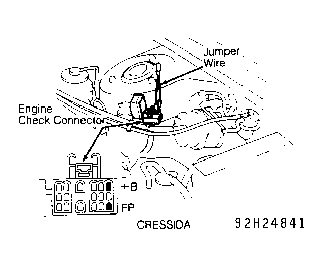 3. Tighten union bolt. Reconnect negative battery cable. Install jumper wire between +B and FP terminals of engine check connector. See Figure-3. Turn ignition on and note fuel pressure. Fuel pressure should be within specification. See FUEL PUMP PERFORMANCE  table.