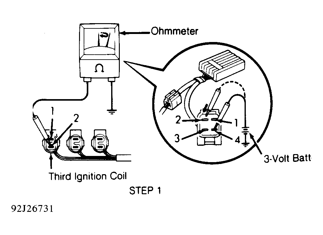 - Turn ignition on. Connect ohmmeter between terminal No. 2 of third ignition coil and ground. See Fig 1-21. Using a 3-volt battery, apply 3 volts to terminal No. 2 of 4-pin connector. See Fig 1-21. With 3 volts applied, ensure ohmmeter indicates continuity momentarily.