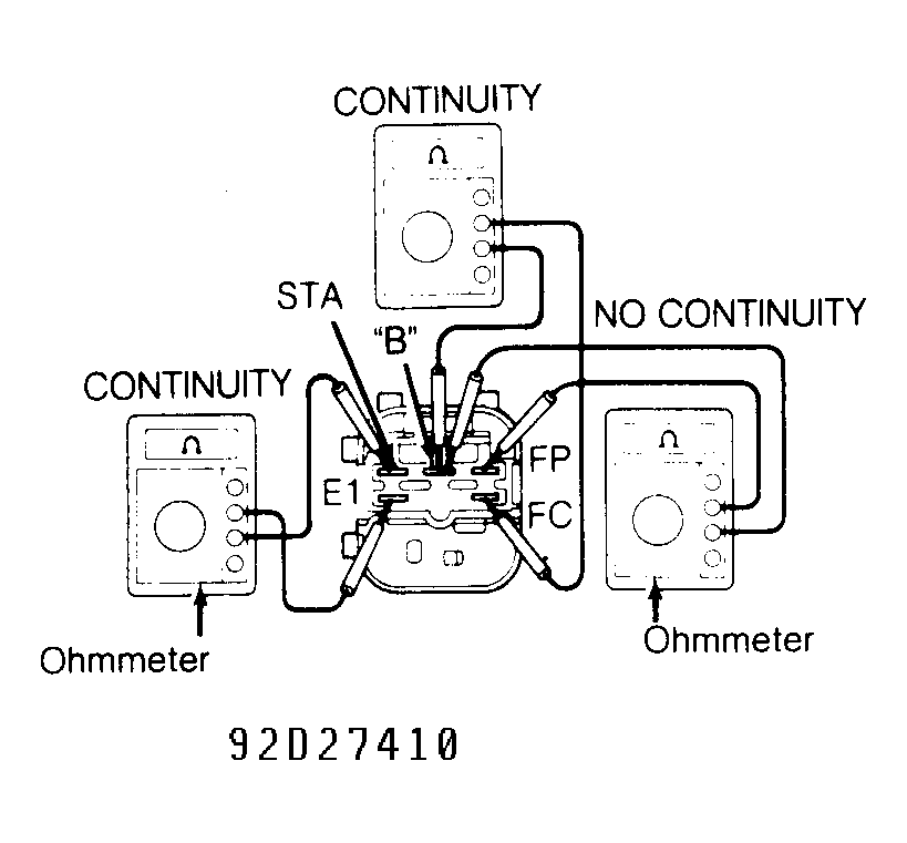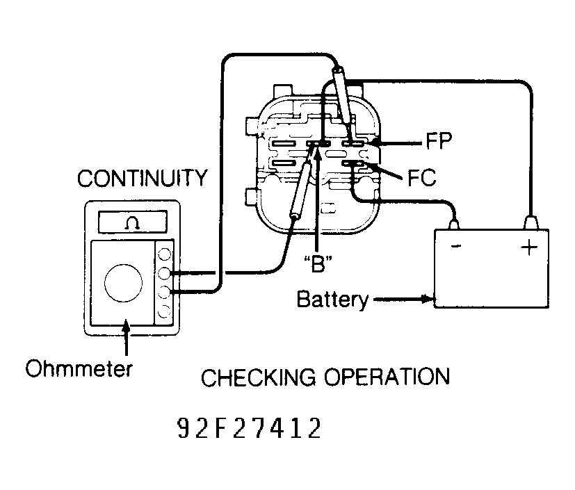- Check circuit opening relay operation by applying battery voltage and checking continuity between specified terminals. See Fig 1-Fig 3 . Replace circuit opening relay if defective.
