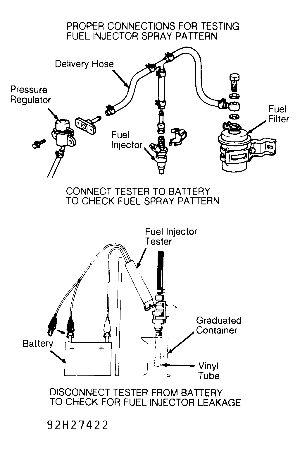 - To check fuel injector spray pattern and volume, remove fuel injectors. See N - REMOVE/INSTALL/OHAUL article in the ENGINE PERFORMANCE Section. Disconnect fuel hose from fuel filter outlet. Use Delivery Hose (09268-41045) to install fuel injector between fuel filter and fuel pressure regulator. See Fig 1.
