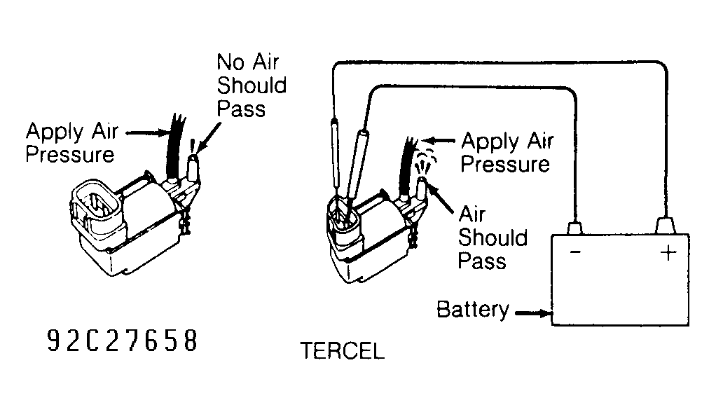 - Remove idle-up system Vacuum Switching Valve (VSV), located near end of valve cover (Tercel) on passenger's side.NOTE: The VSV may also be identified by appropriate illustration in THEORY/OPERATION article in the ENGINE PERFORMANCE Section or wire color. See appropriate wiring diagram in WIRING DIAGRAMS article in the ENGINE PERFORMANCE Section.