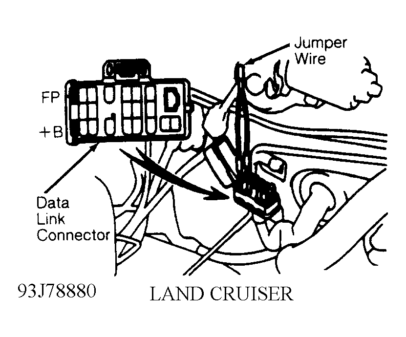 - Install Jumper Wire (SST-09843-18020) between +B and FP terminals of data link connector. See Fig 1. The data link connector is located in engine compartment.