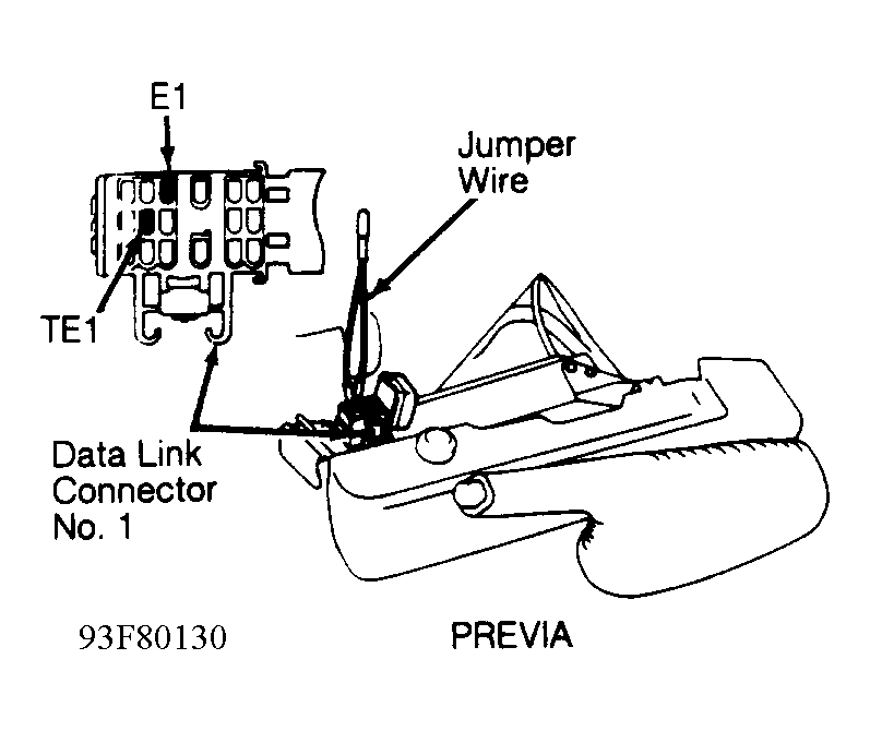 2. Apply parking brake and place transmission/transaxle in Neutral. Install Jumper Wire (SST 09843-18020) between terminals TE1 and E1 of data link connector No. 1. See Fig 1. Start engine and note engine RPM.
