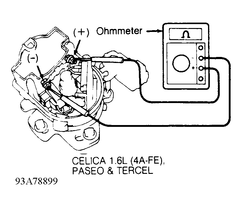 - Disconnect wiring from ignition coil so ignition coil is isolated from system. Using ohmmeter, check primary resistance between ignition coil positive (+) and negative (-) terminals. See Fig 1.
