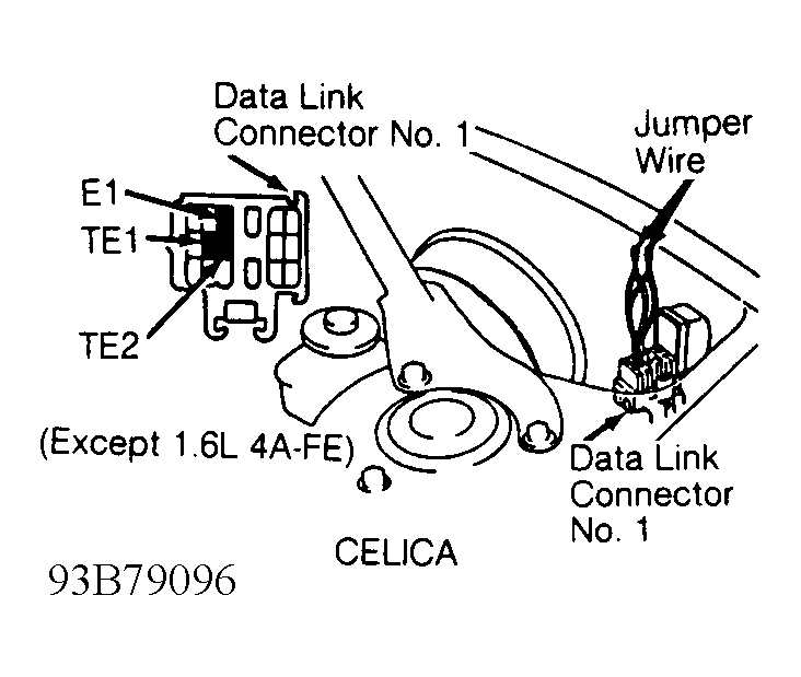 - Install Jumper Wire (SST 09843-18020) between terminals TE2 and E1 in Data Link Connector (DLC) with ignition off. See Fig 1.