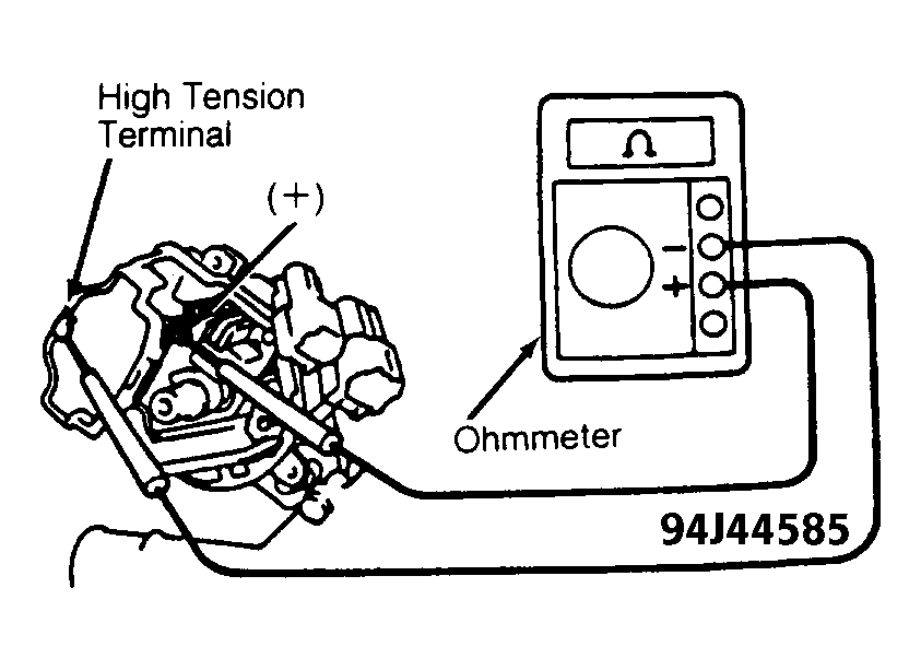 2. Check secondary resistance between ignition coil positive (+) terminal and high tension terminal (coil wire tower). See Fig 2. Replace ignition coil if resistance is not within specification. See appropriate IGNITION COIL RESISTANCE  table.