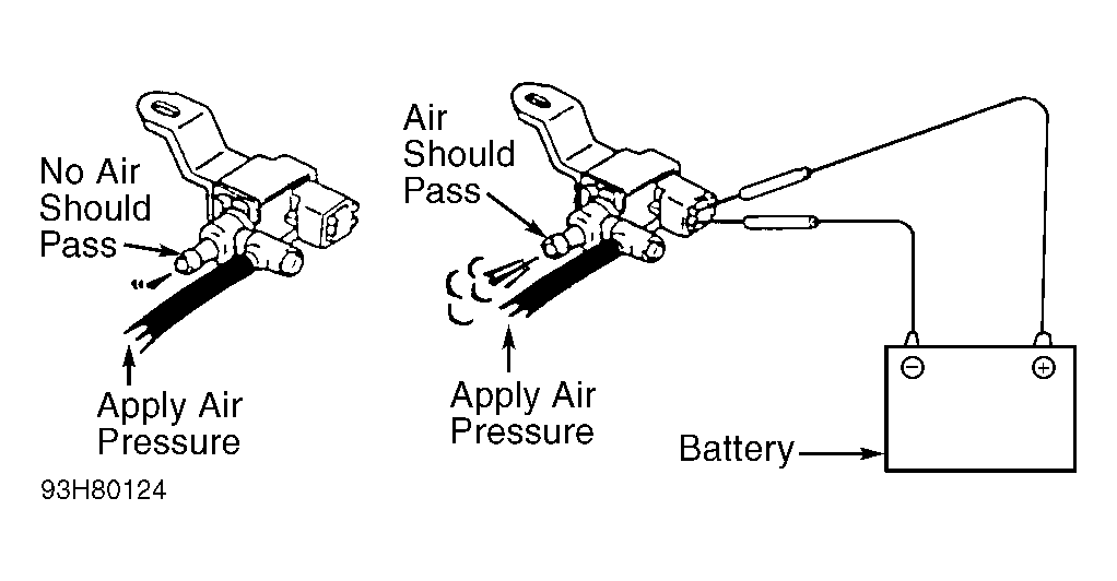 - Ensure no continuity exists between each electrical terminal and body of A/C idle-up valve. To check A/C idle-up valve operation, apply air pressure to designated area and checking air passage, and then applying battery voltage and ground and retesting. See Fig 1. Replace A/C idle-up valve if defective.