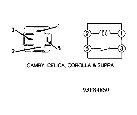 - Using an ohmmeter, check continuity between terminals No. 1and 2. Continuity should exist. See Fig 1. Apply battery voltage to terminal No. 1 and ground terminal No. 2. Continuity should exist at terminals No. 3 and 5. If relay does not test as described, replace power window main relay.