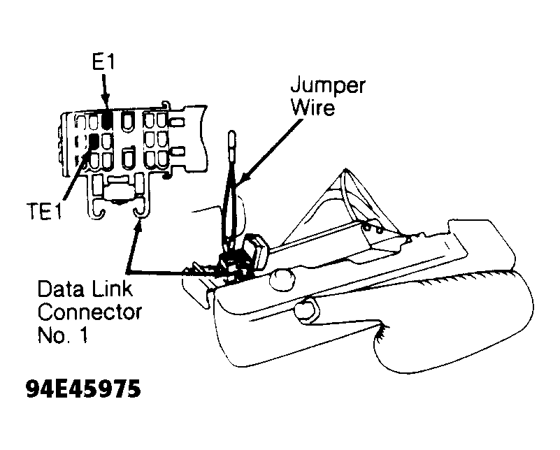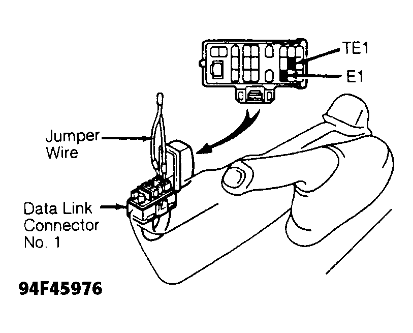 - Apply parking brake and place transmission/transaxle in Neutral. Install Jumper Wire (SST 09843-18020) between terminals TE1 and E1 of data link connector No. 1. See Fig 1 and Fig 2. Start engine and note engine RPM.NOTE: Data link connector No. 1 is located in engine compartment on all models except Previa. On Previa, data link connector No. 1 is located under below driver's seat.