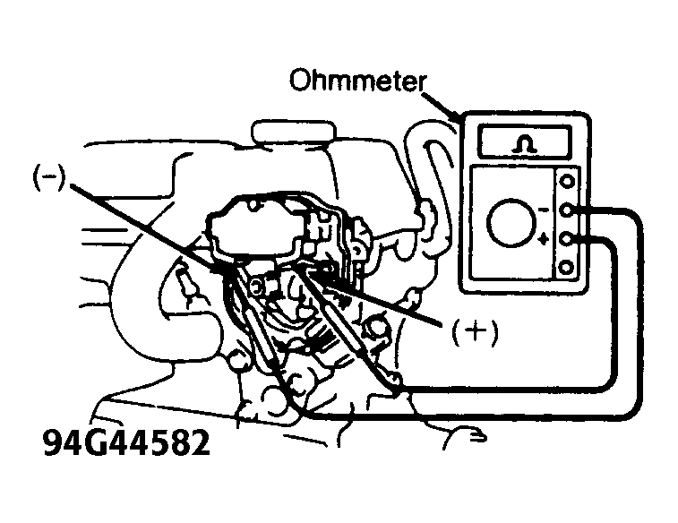 - Disconnect wiring from ignition coil so ignition coil is isolated from system. Using ohmmeter, check primary resistance between ignition coil positive (+) and negative (-) terminals. See Fig 1.