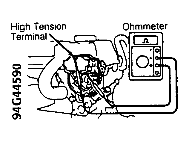 - Check secondary resistance between ignition coil positive (+) terminal and high tension terminal (coil wire tower). See Fig 2. Replace ignition coil if resistance is not within specification. See appropriate IGNITION COIL RESISTANCE table.