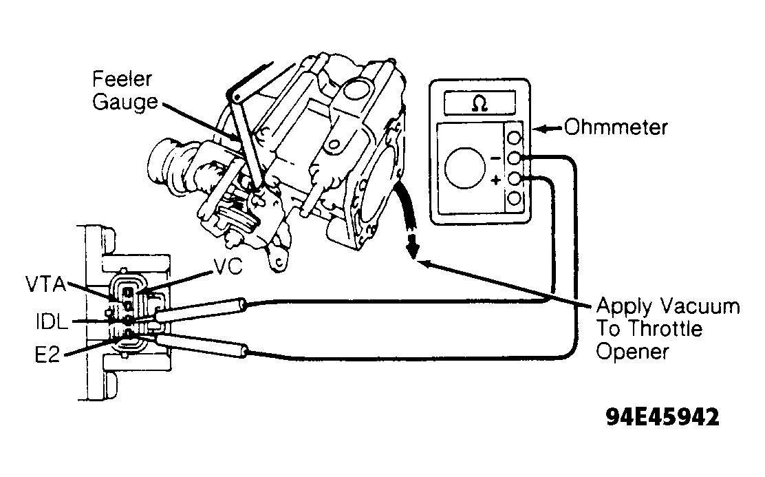 - Insert specified thickness feeler gauge between throttle stop screw and throttle lever and check resistance or continuity. See TPS RESISTANCE SPECIFICATIONS table. Replace or adjust TPS if not within specification.