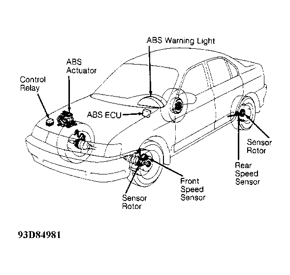 Anti-Lock Brake System (ABS) consists of an ABS Electronic Control Unit (ECU), control relay, actuator, and 4 speed sensors. See Fig 1.