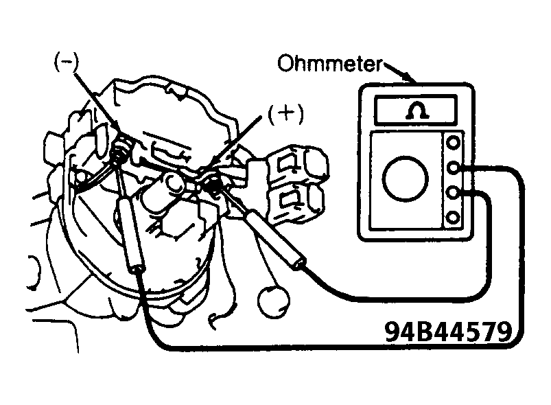 - Disconnect wiring from ignition coil so ignition coil is isolated from system. Using an ohmmeter, check primary resistance between ignition coil positive (+) and negative (-) terminals. See Fig 1 and Fig 2.